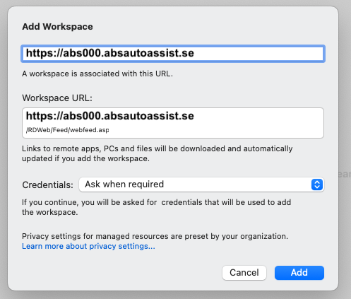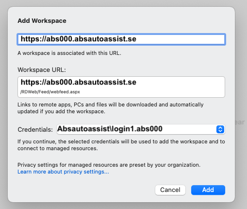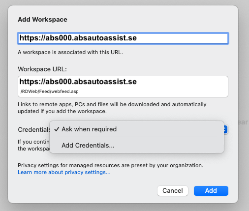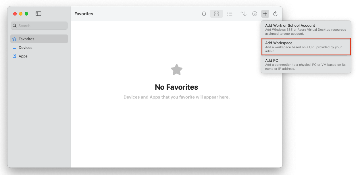- Starta Microsoft Windows App och klicka på plusikonen i menyn och välj "Add Worskspace".
