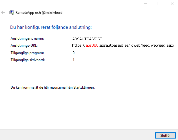- Anslutningen är nu konfigurerad, avsluta installationsguiden genom att klicka på "Slutför".
