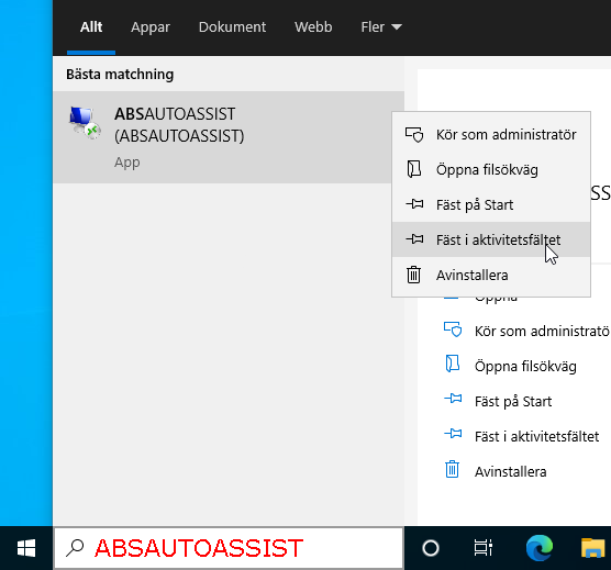 - För att starta ABS Autoassist så klickar ni på startmenyn längst ner till vänster och skriver "ABSAUTOASSIST" i sökfältet.